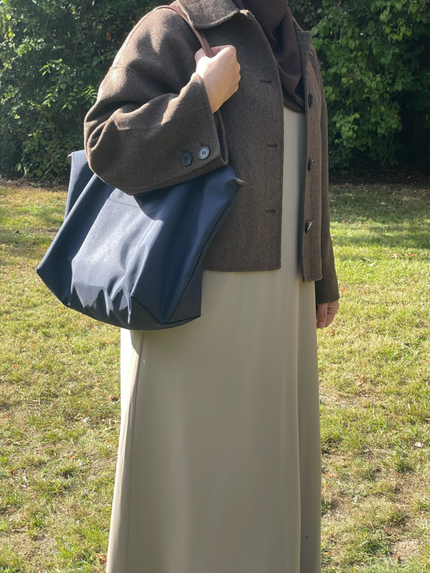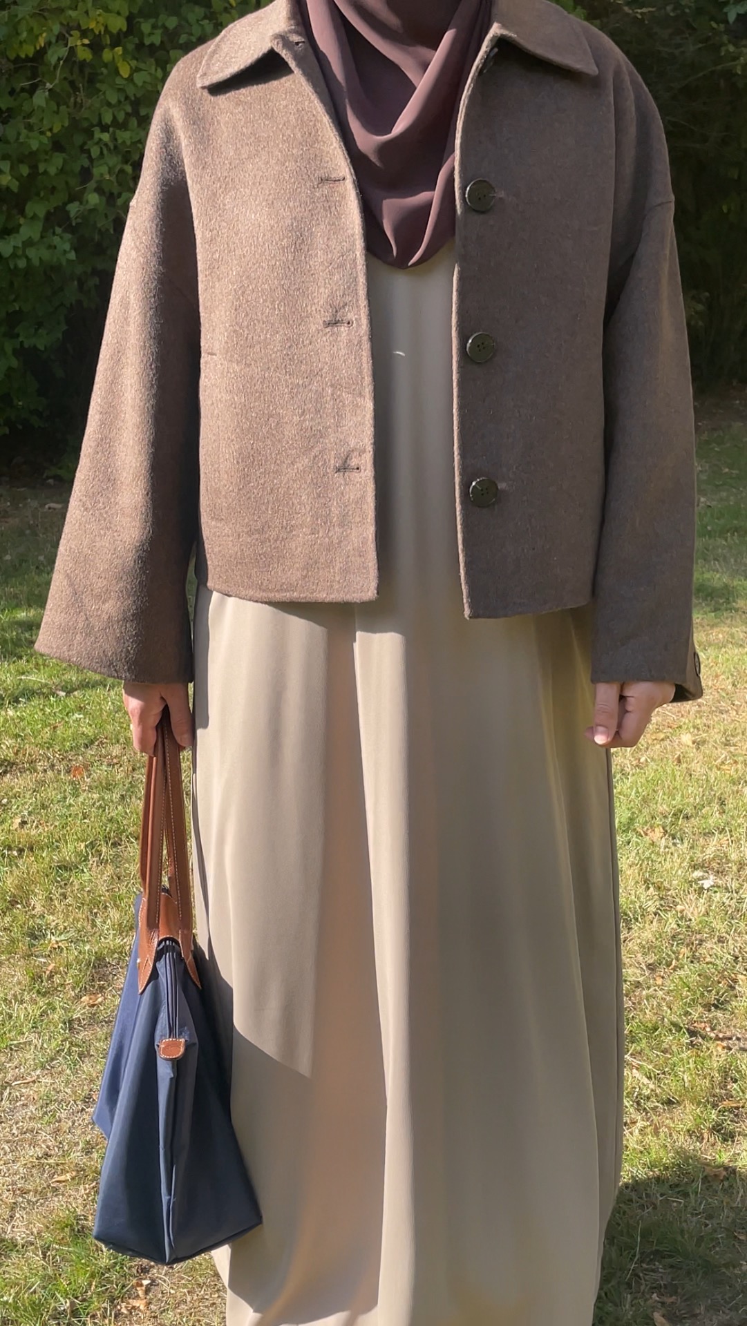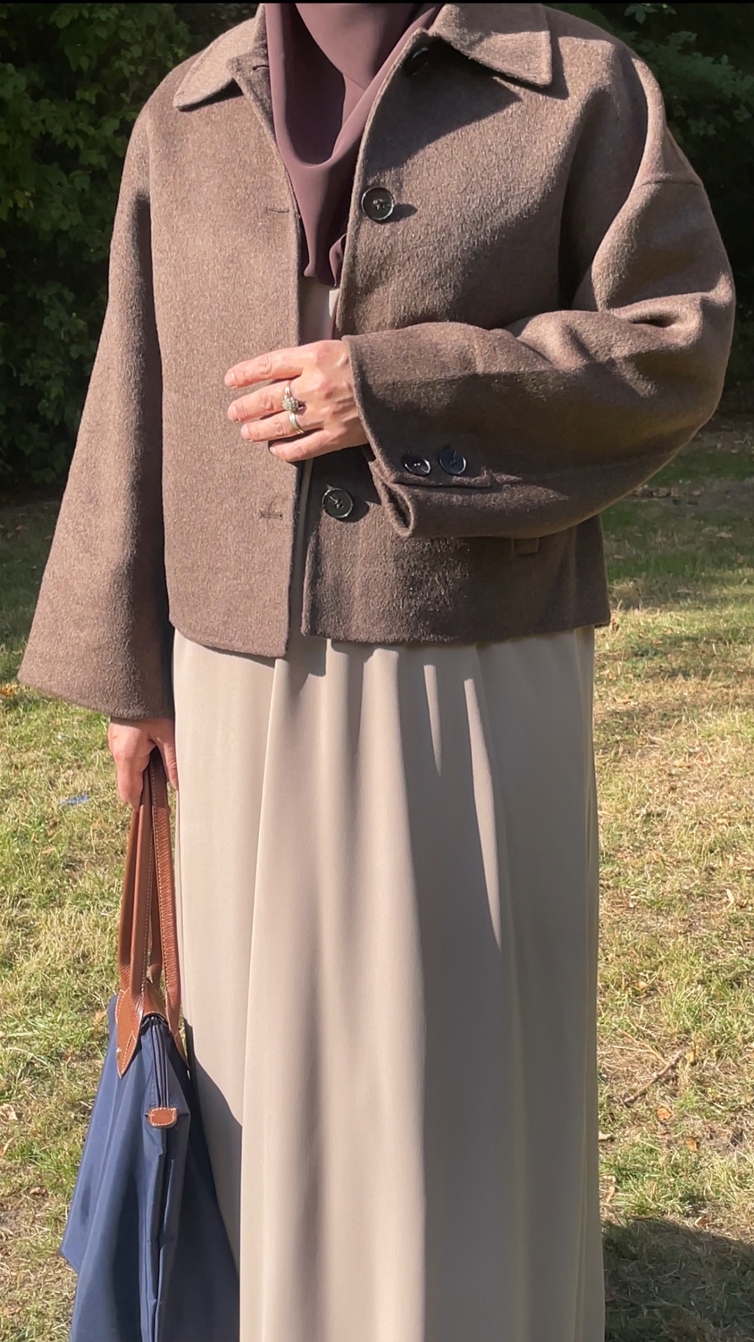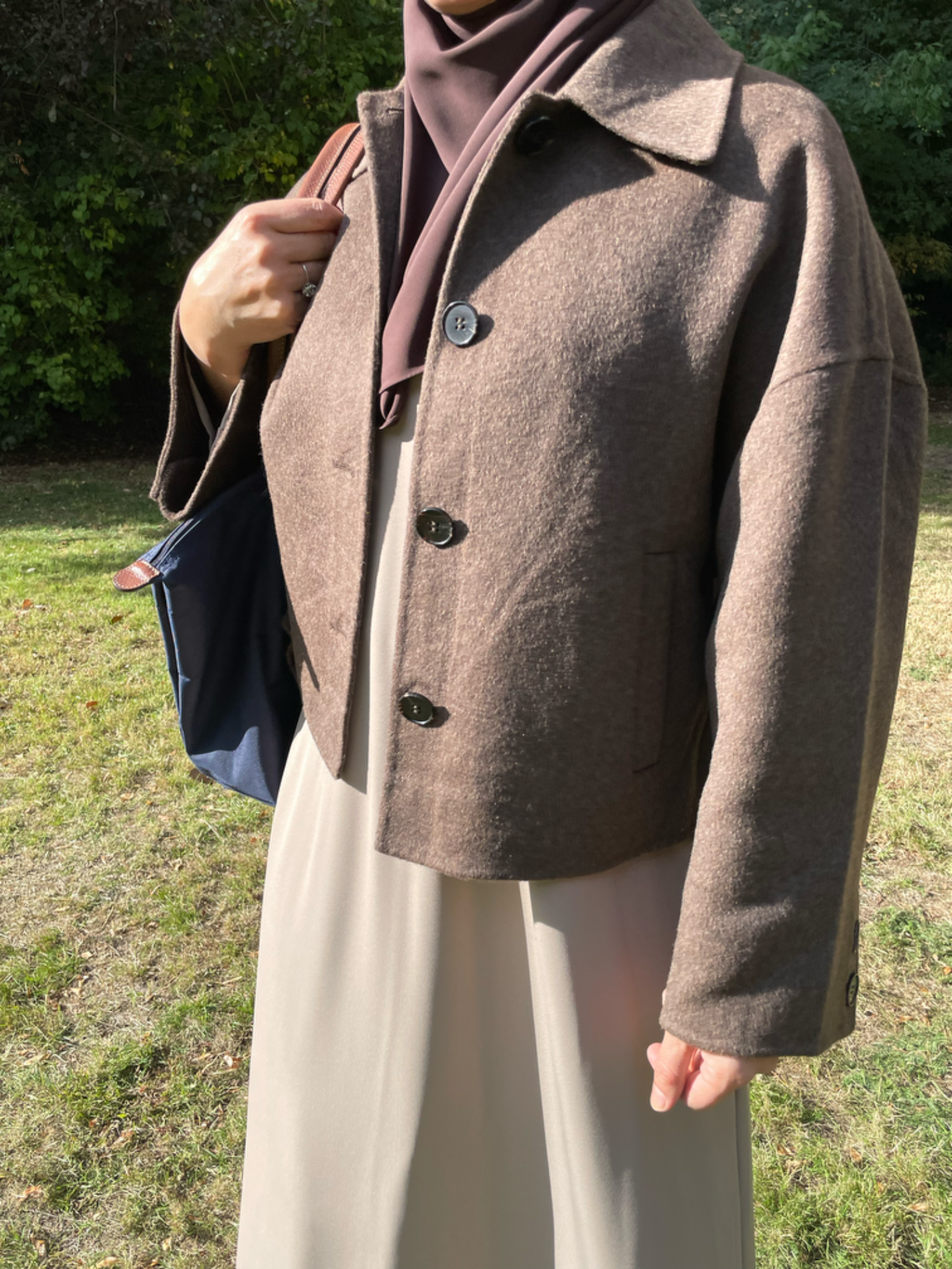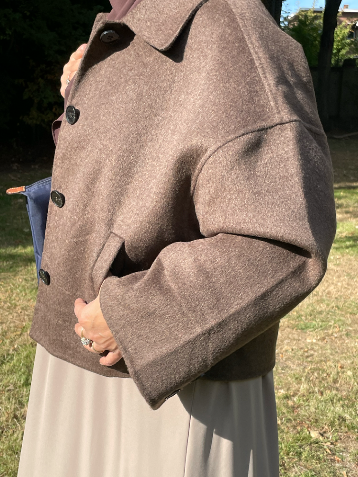 Halflange jas gemaakt van wolmix (zie samenstelling). Hemdkraag. Twee zijzakken. Losse vorm.