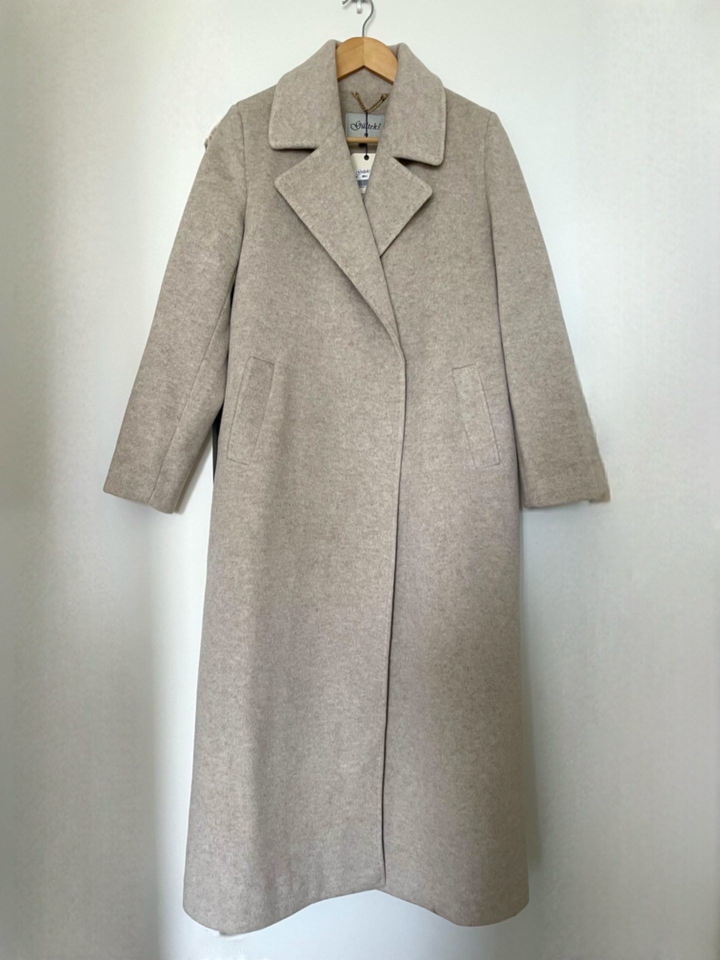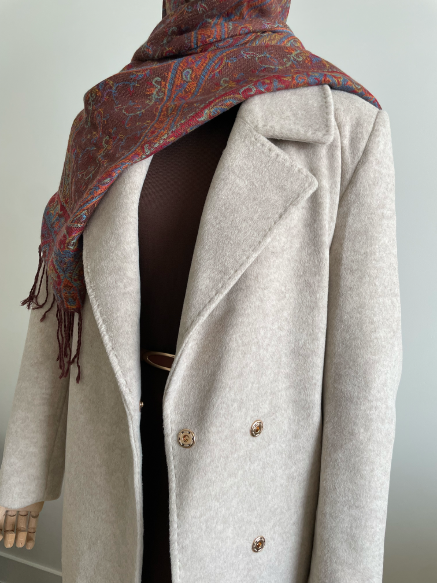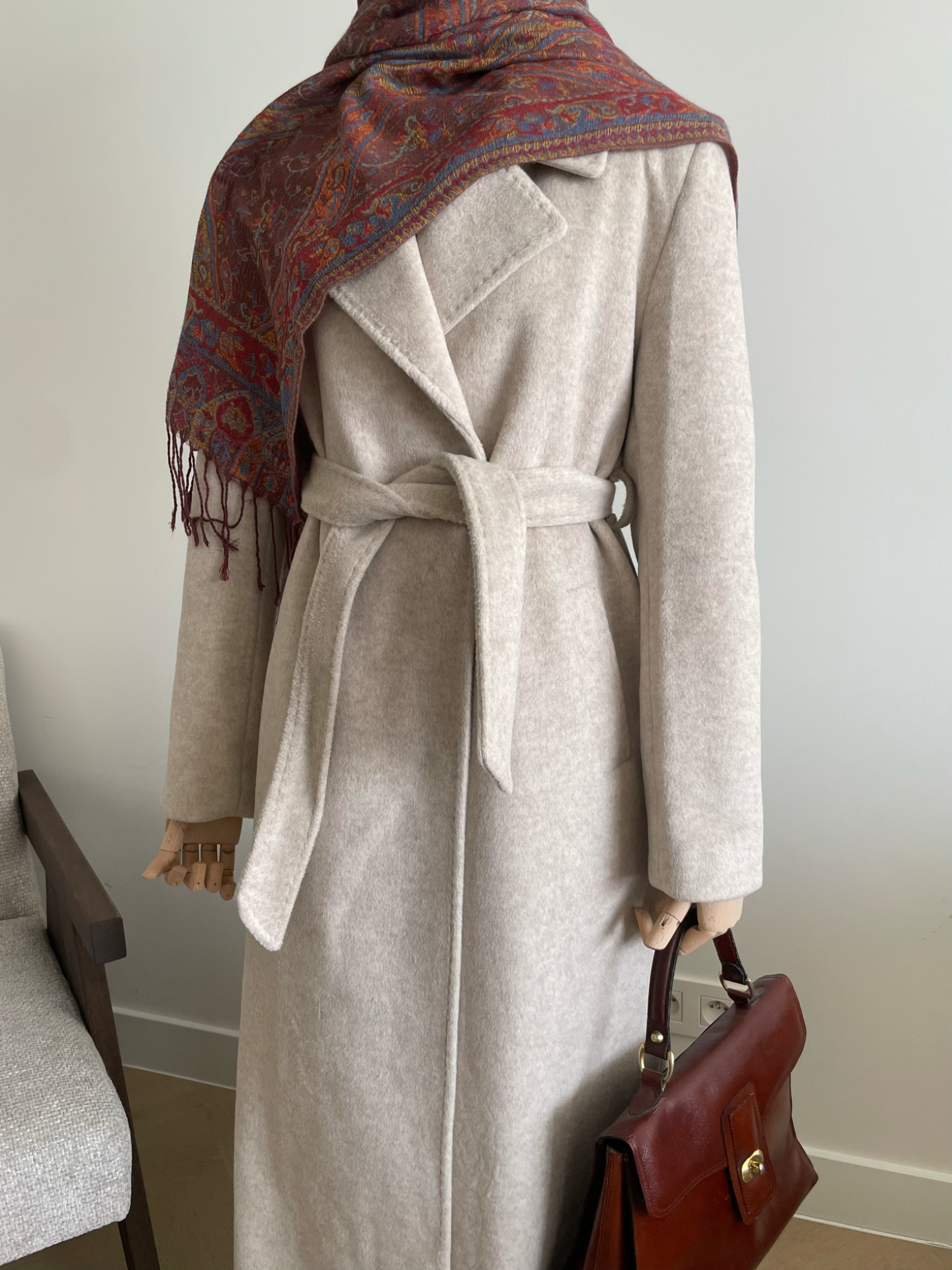 Warme lange jas van wol met ceintuur. Reverskraag. Twee zijzakken. Split achteraan. Volledig gevoerd.Drukknoop sluiting. Losse pasvorm en het valt ruim. We raden een maat kleiner te bestellen. Lengte ongeveer 125cm.