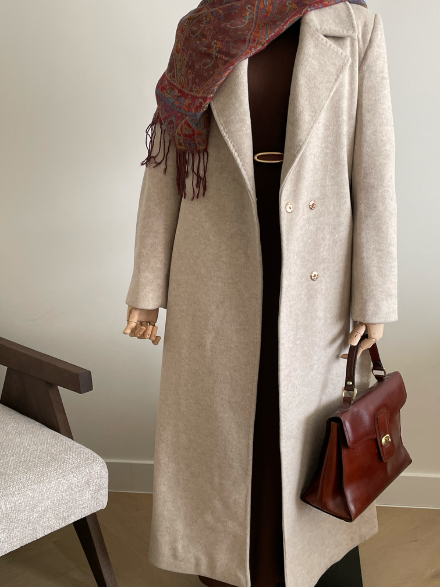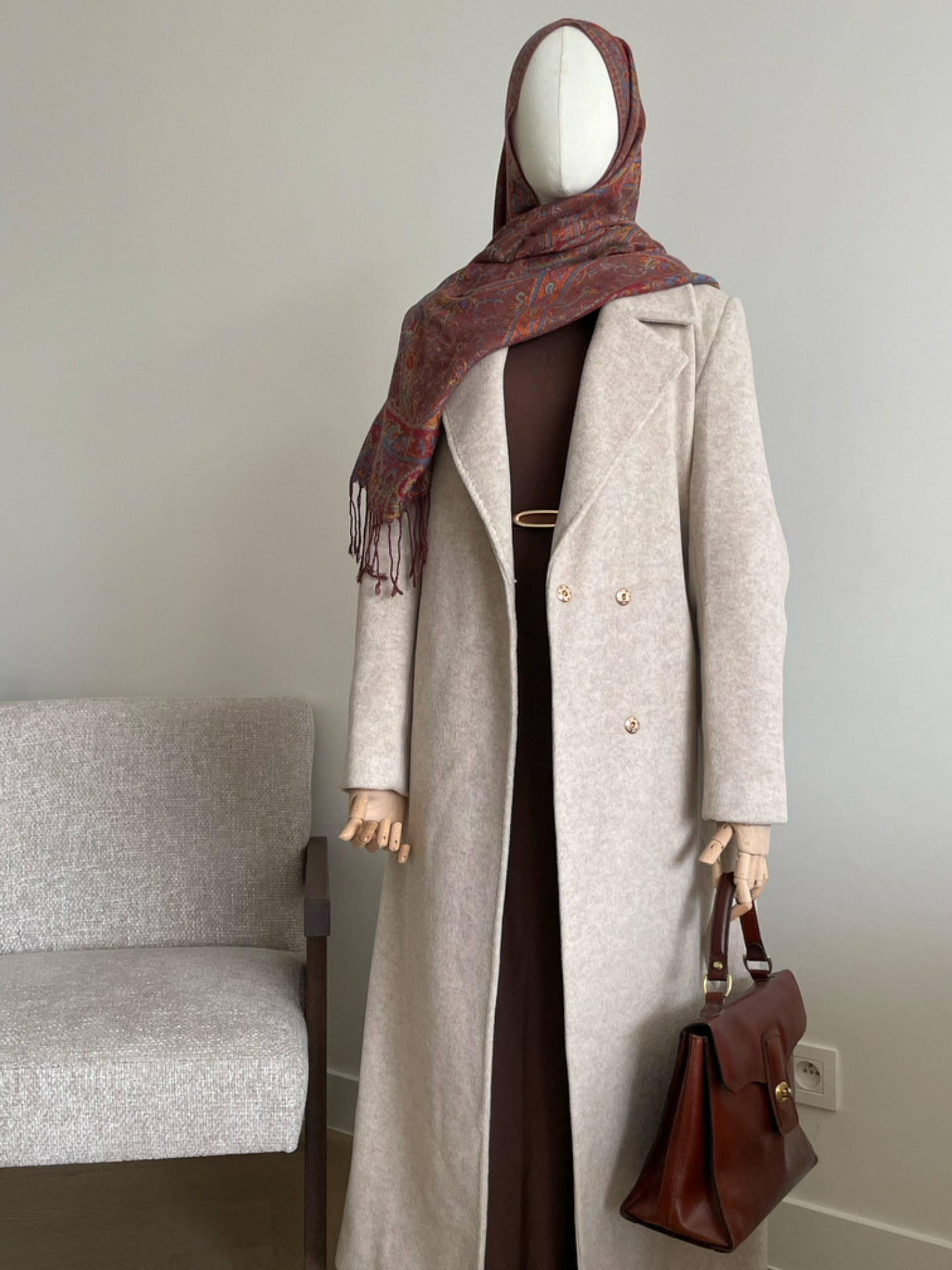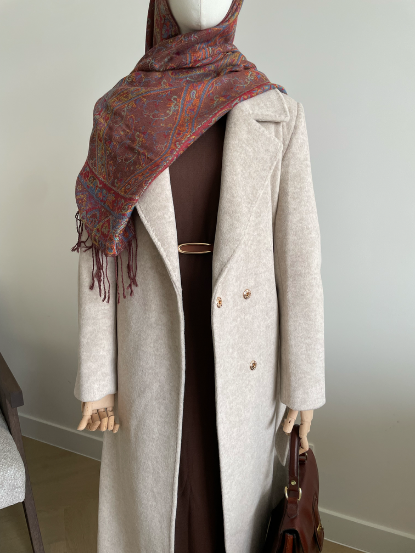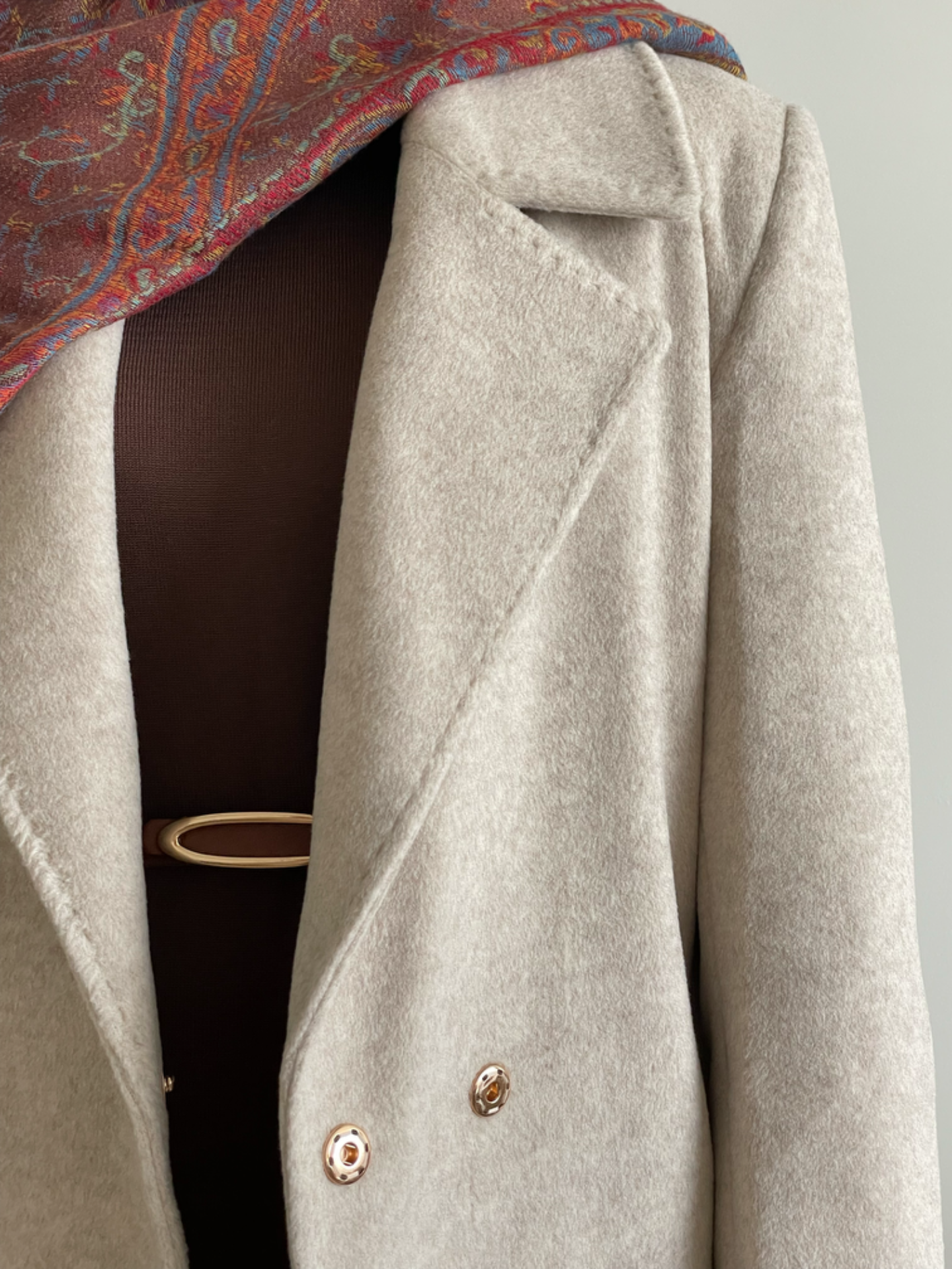 Warme lange jas van wol met ceintuur. Reverskraag. Twee zijzakken. Split achteraan. Volledig gevoerd.Drukknoop sluiting. Losse pasvorm en het valt ruim. We raden een maat kleiner te bestellen. Lengte ongeveer 125cm.