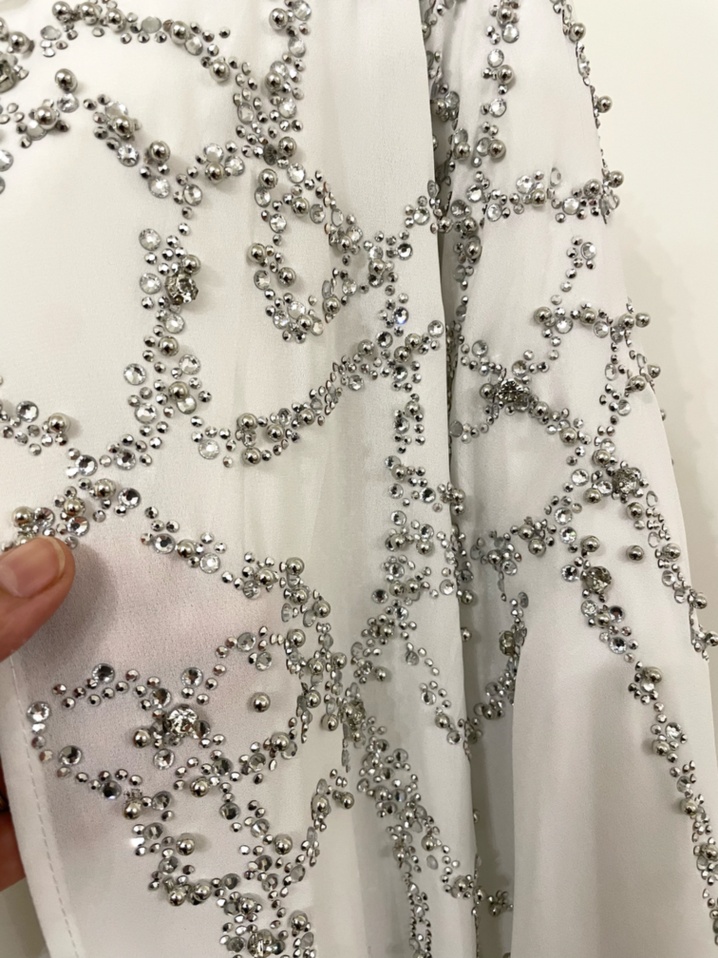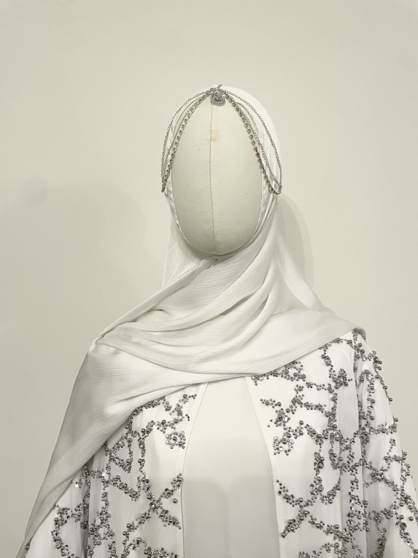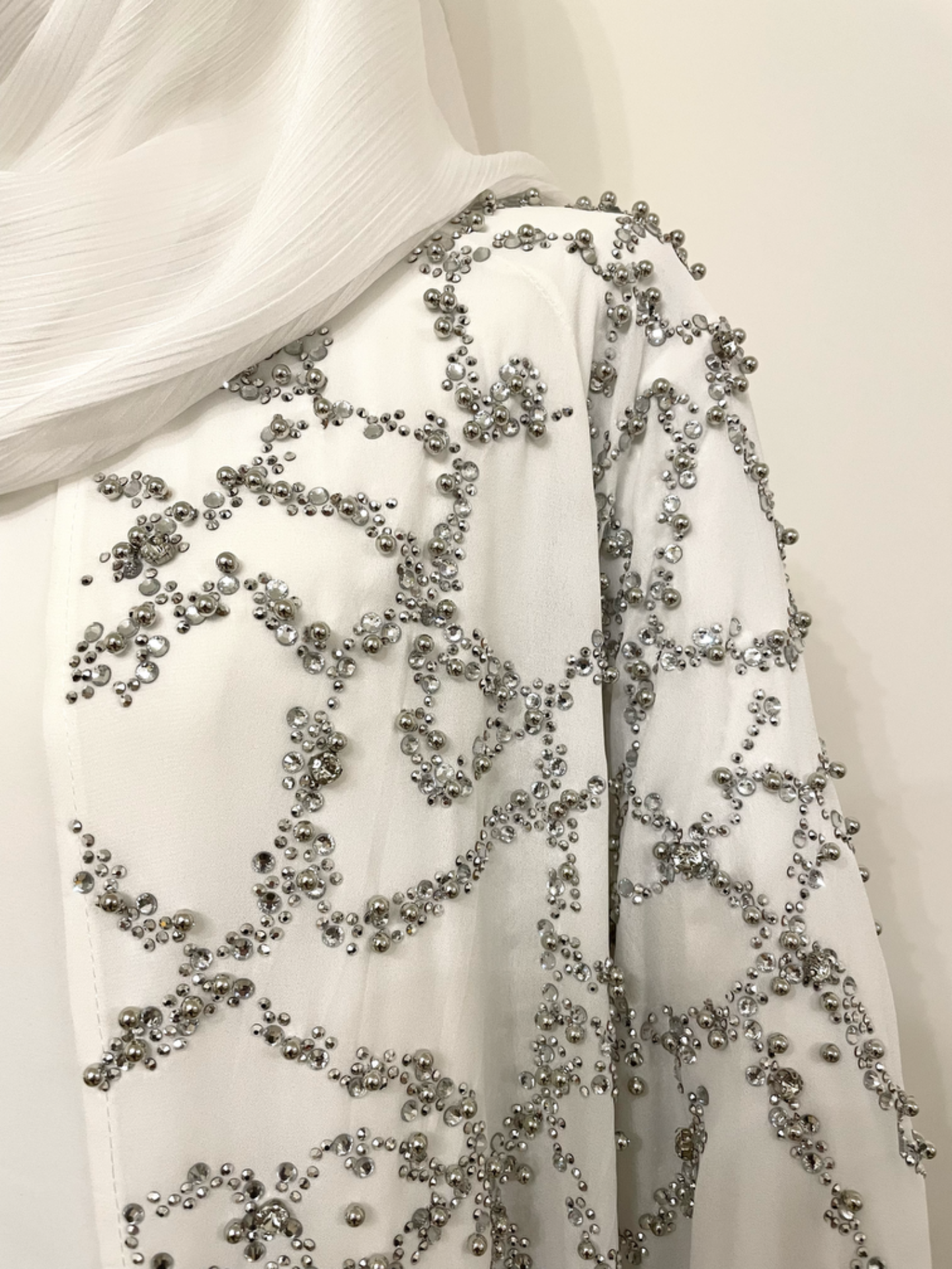 De Lina Abaya is een verfijnd en elegant ontwerp, perfect voor bijzondere gelegenheden. De transparante stof is rijkelijk bewerkt met subtiele fonkelende steentjes, wat zorgt voor een luxueuze en vrouwelijke uitstraling.