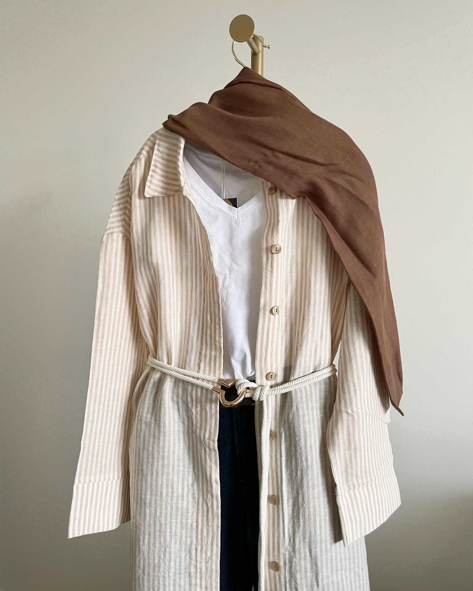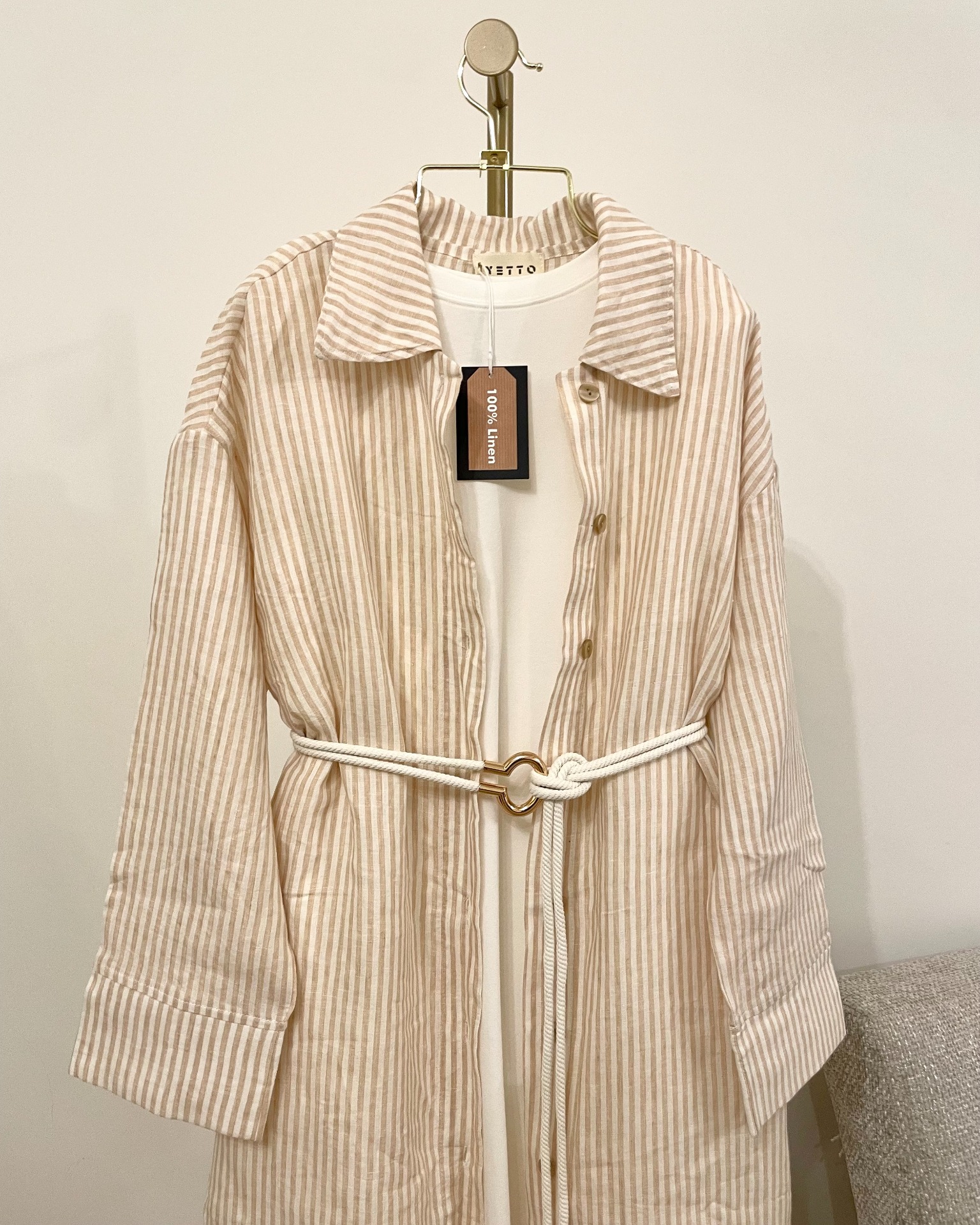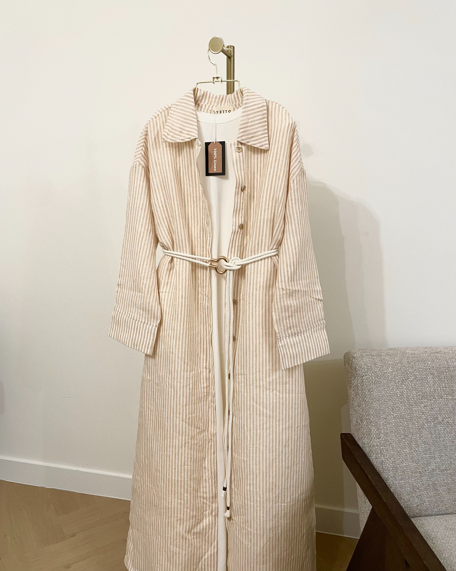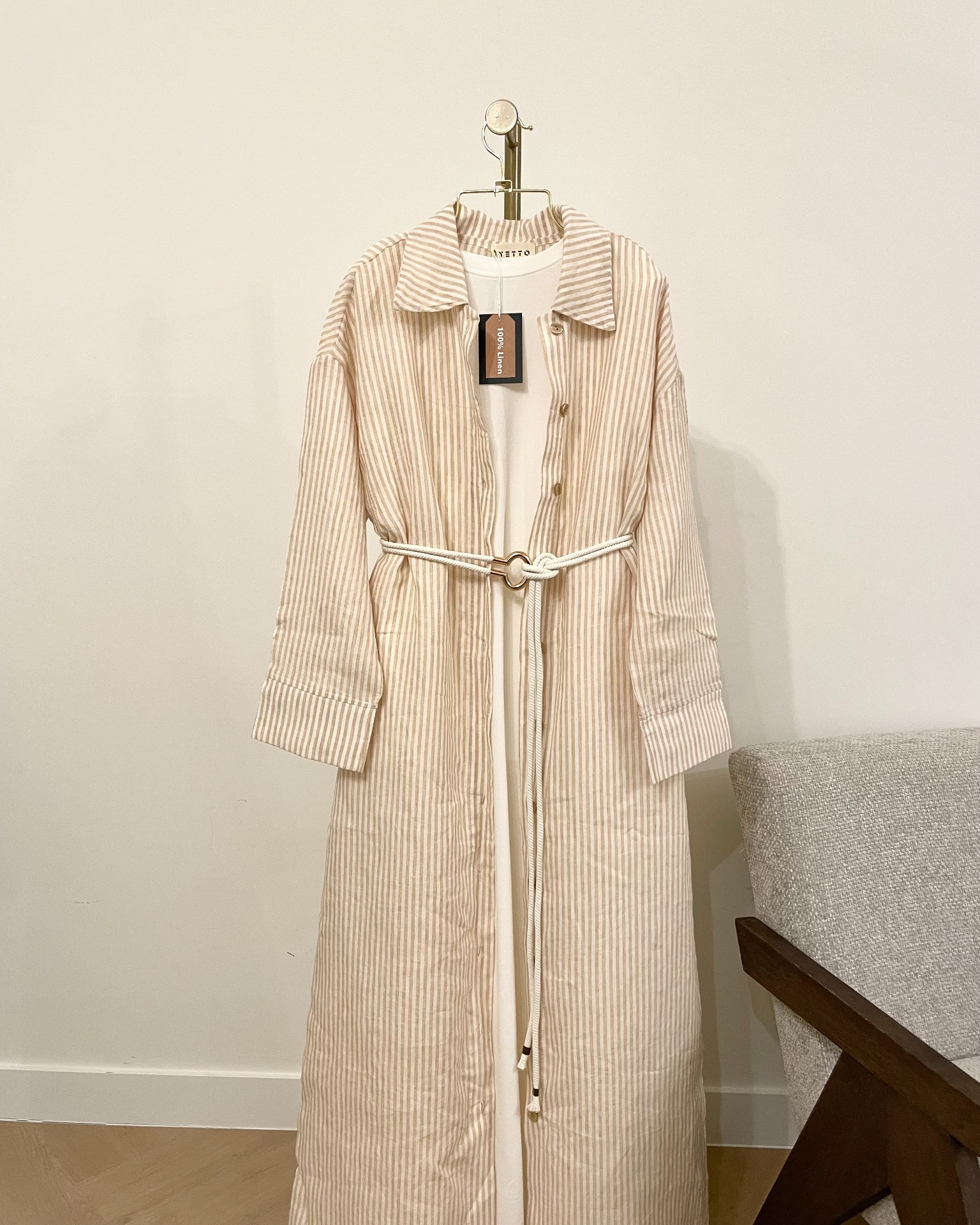 Deze elegante linnen jurk met knoopjes combineert comfort en karakter in één tijdloos ontwerp. Gemaakt van 100% hoogwaardig linnen, voelt de stof luchtig en ademend aan — perfect voor warme dagen en stijlvol in elk seizoen.