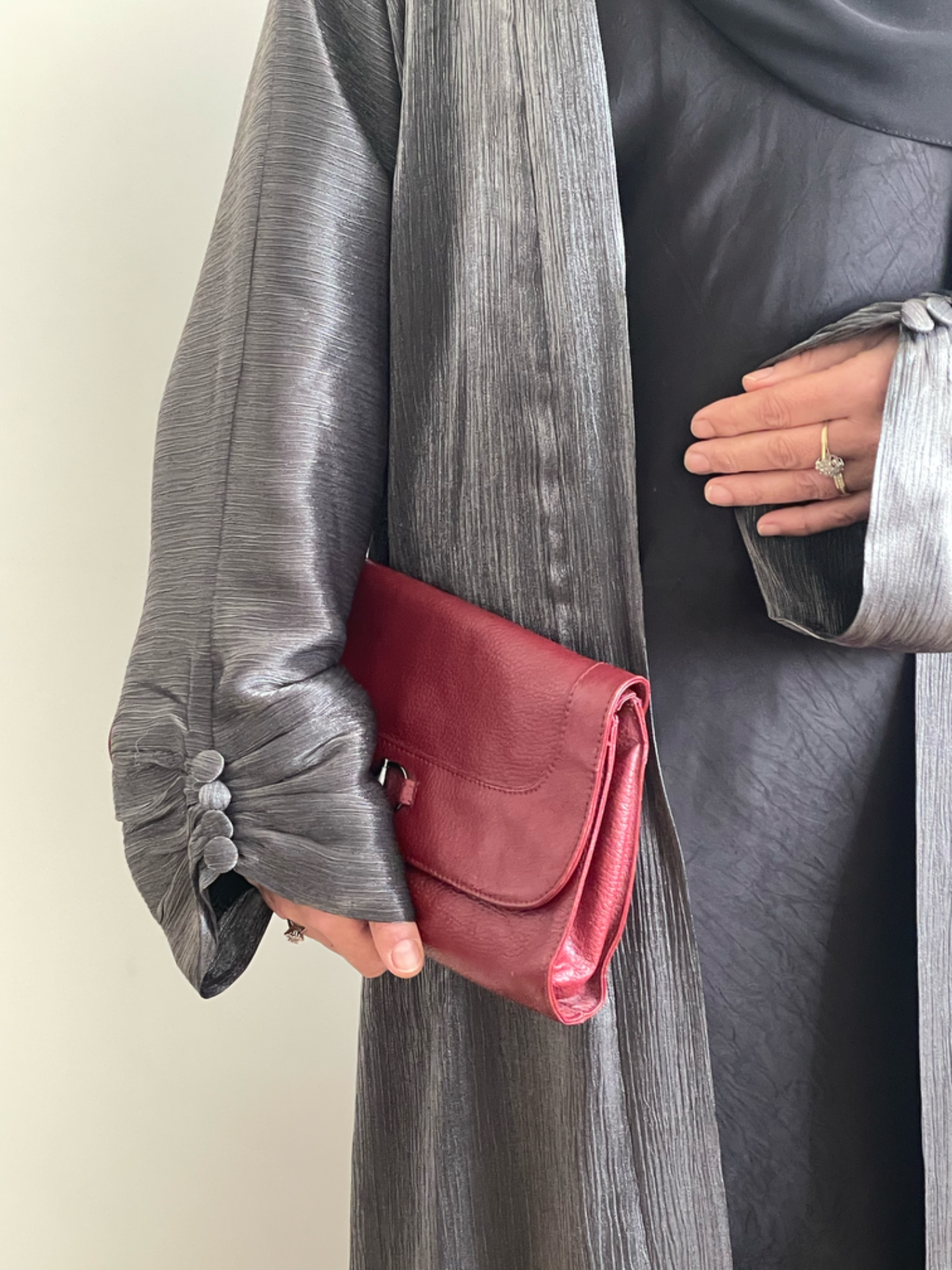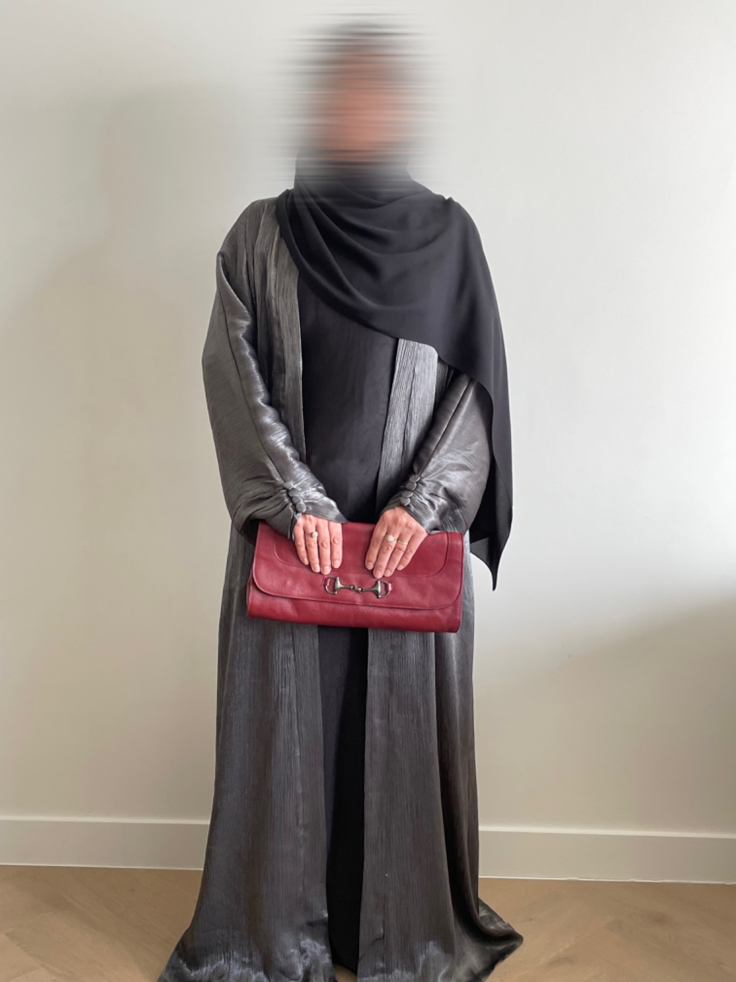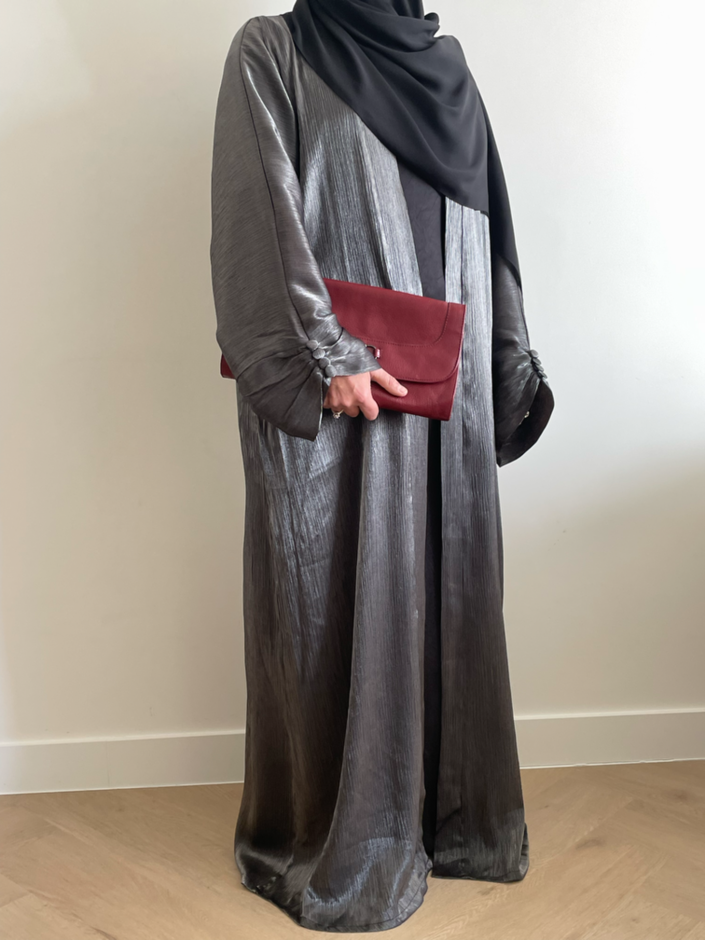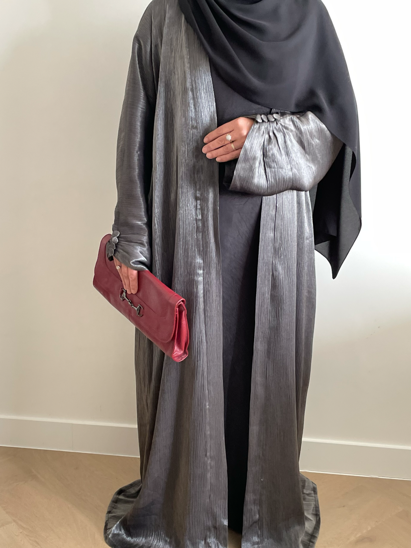 Elegante abaya-kimono met riem van zelfde stof. Knoop detailles bij de armen. Lengte ongeveer 145cm. Zilver-zwart blinkende stof. Mooie keuze als bruiloftgast outfit.